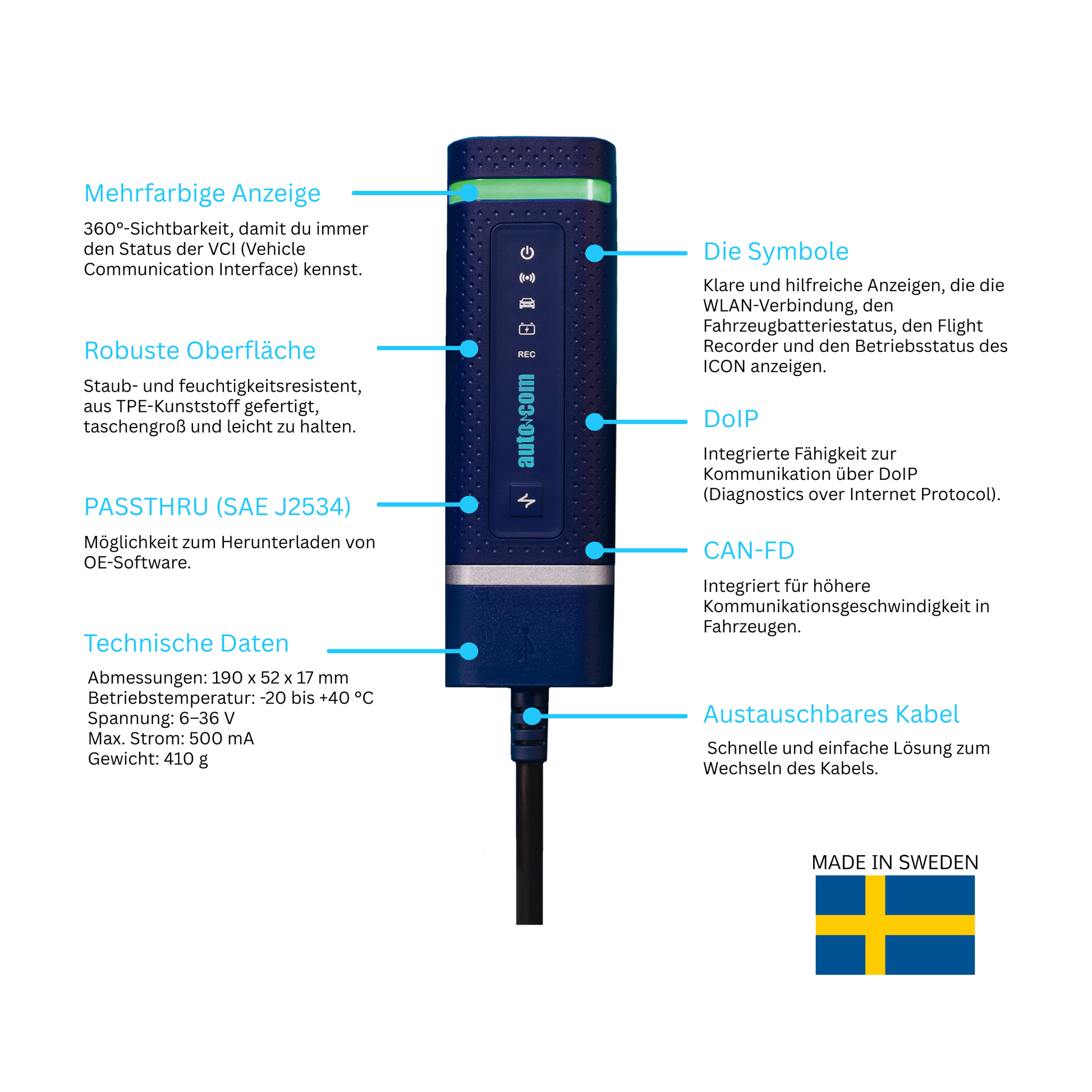 Der Autocom ICON ist das vielseitige Diagnosegerät für Werkstätten, die mit Fahrzeugen verschiedener Marken arbeiten. In Verbindung mit der CARS Pro Software erhalten Sie ein vollwertiges Diagnosesystem für Pkw und leichte Nutzfahrzeuge – inklusive Zugang zu gesicherten Fahrzeugen über das integrierte Autocom Secure Gateway.